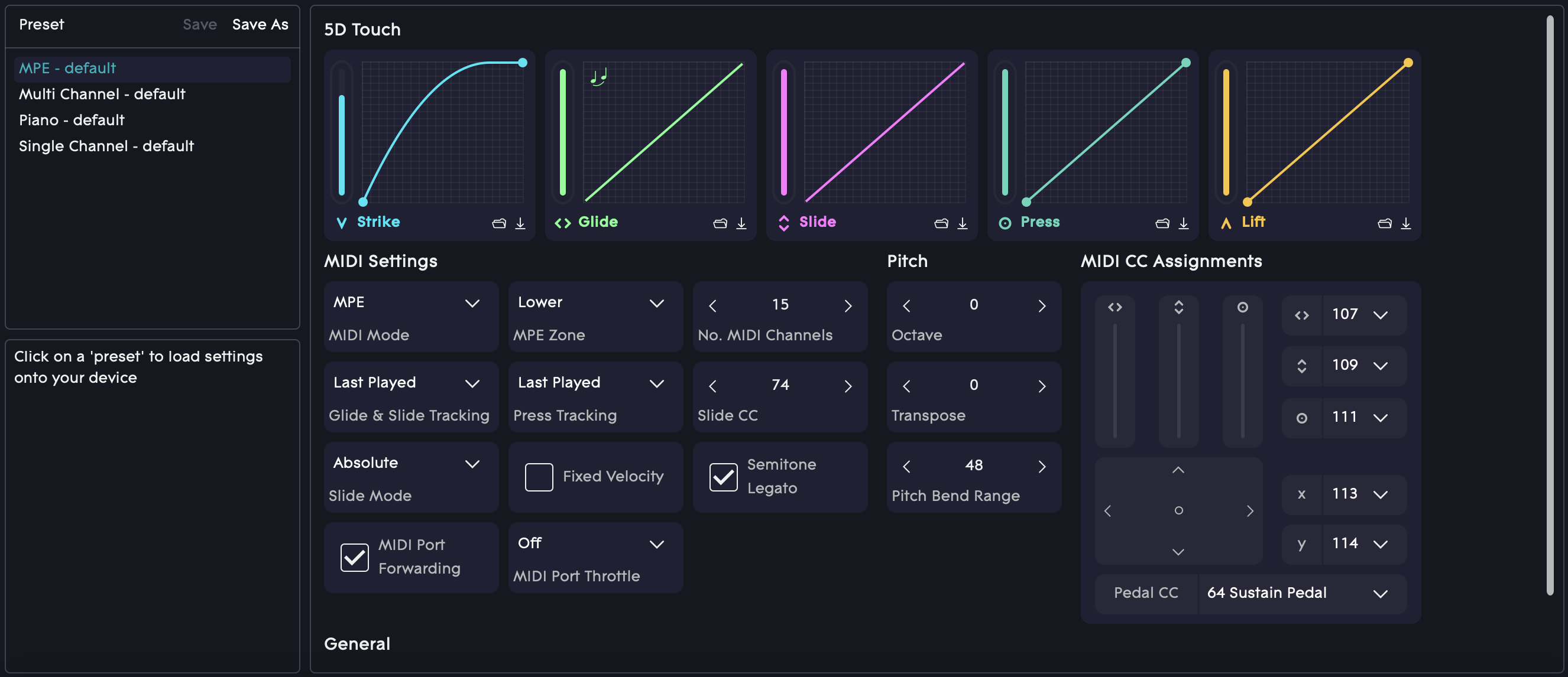 Open ROLI Dashboard and select Multi Channel mode with MPE on. Next select a channel range. With MPE mode on, channel 1 is the global channel, and channels 2 onwards are note channels. The number of note channels you select will determine the expressive polyphony.