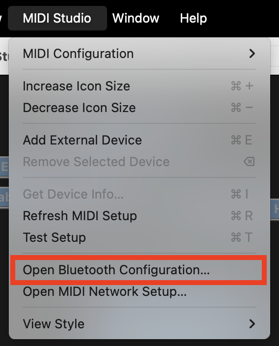 - In the top menu bar, go to MIDI Studio > Open Bluetooth Configuration...